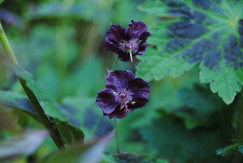 Endelig blomstrer denne Geraniumen. Men den er merket med Geranium oxonianum Frank Lawley. Og det er i alle fall feil. For dette er en Phaeum av noe slag.. Anyone? Lyse blader og mørk lilla blomst.